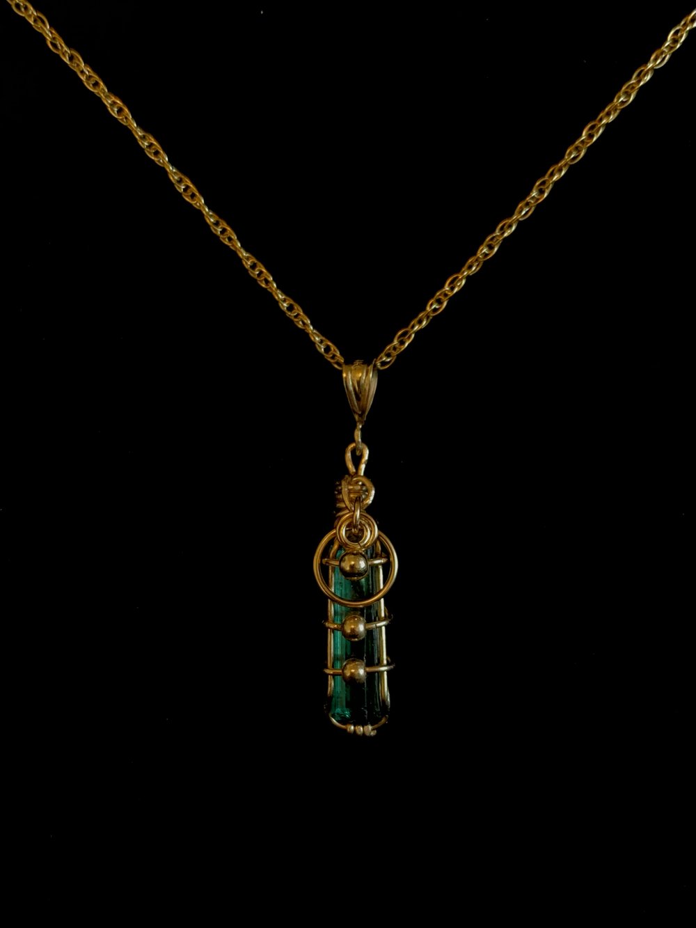 Green Tourmaline necklace wrapped in 14k gold fill, accented with 14k gold filled bars, beads, and hanging rings throughout the piece.