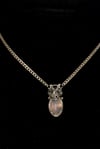 Dusty pink toned Rose Quartz wrapped in .925 sterling silver, adorned with rings of stainless steel throughout. This angelic piece was created with the intention of bringing purifying energy and sweetness through love of all forms to the wearer. ♡