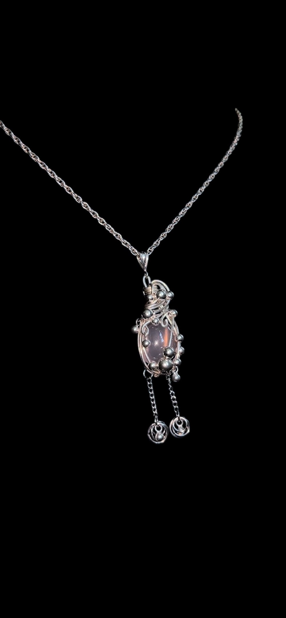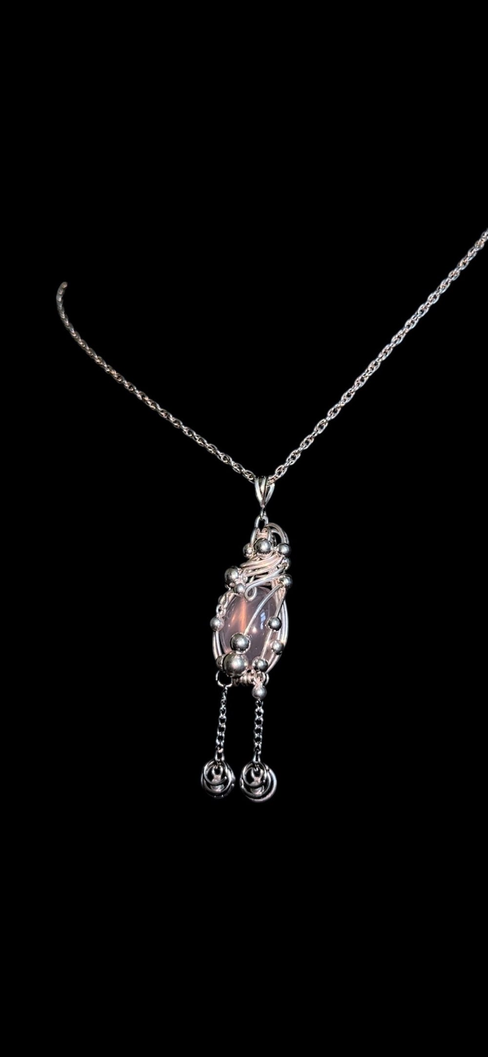 Rose quartz wrapped in .925 sterling silver, heavily adorned with sterling silver orbs throughout the piece, and finished with stainless steel hanging chains.