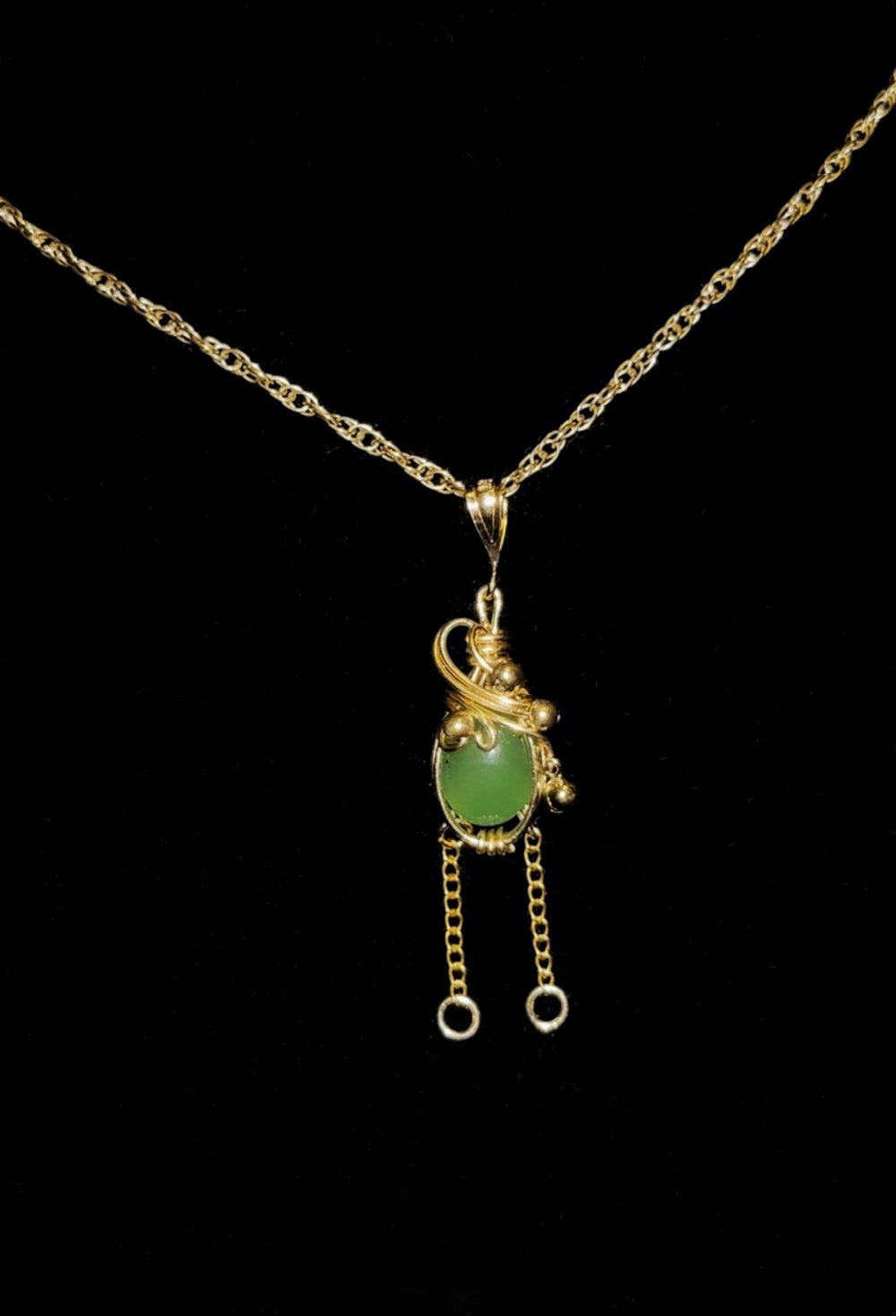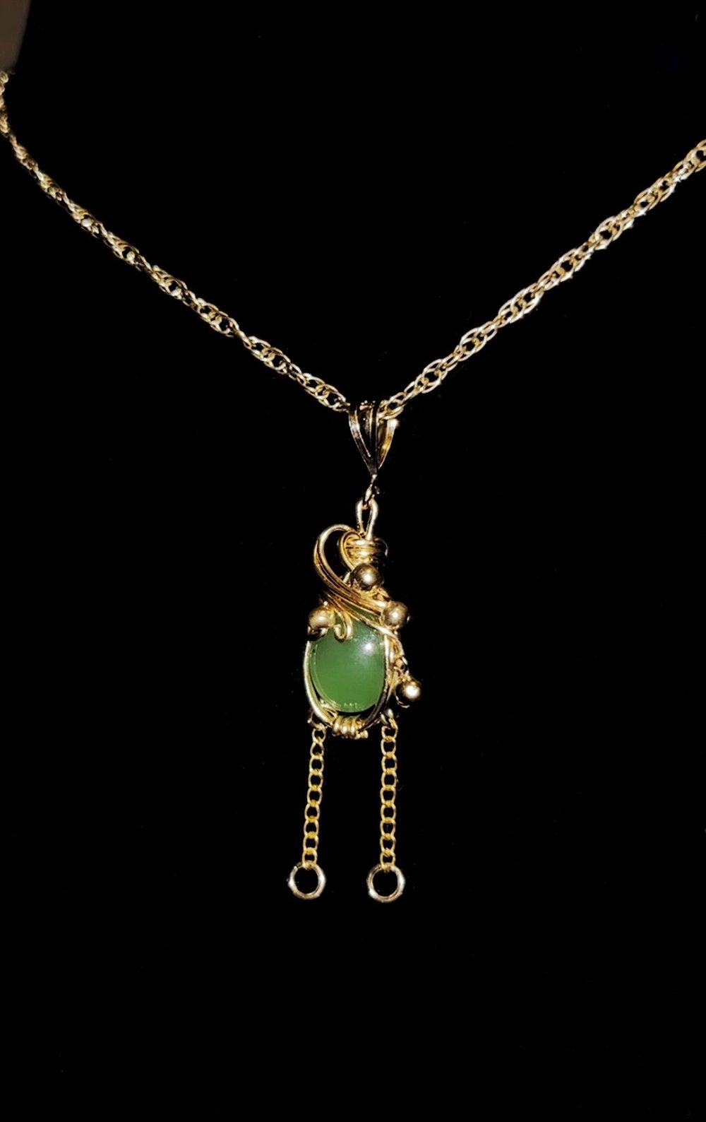 Mini Jade necklace wrapped in 14k gold filled swirls, adorned with a symmetrical hanging chain drop and beaded accents throughout. Inspired by a garden and it's creatures, each swirl is reminiscent of the natural movement of plants present in nature.