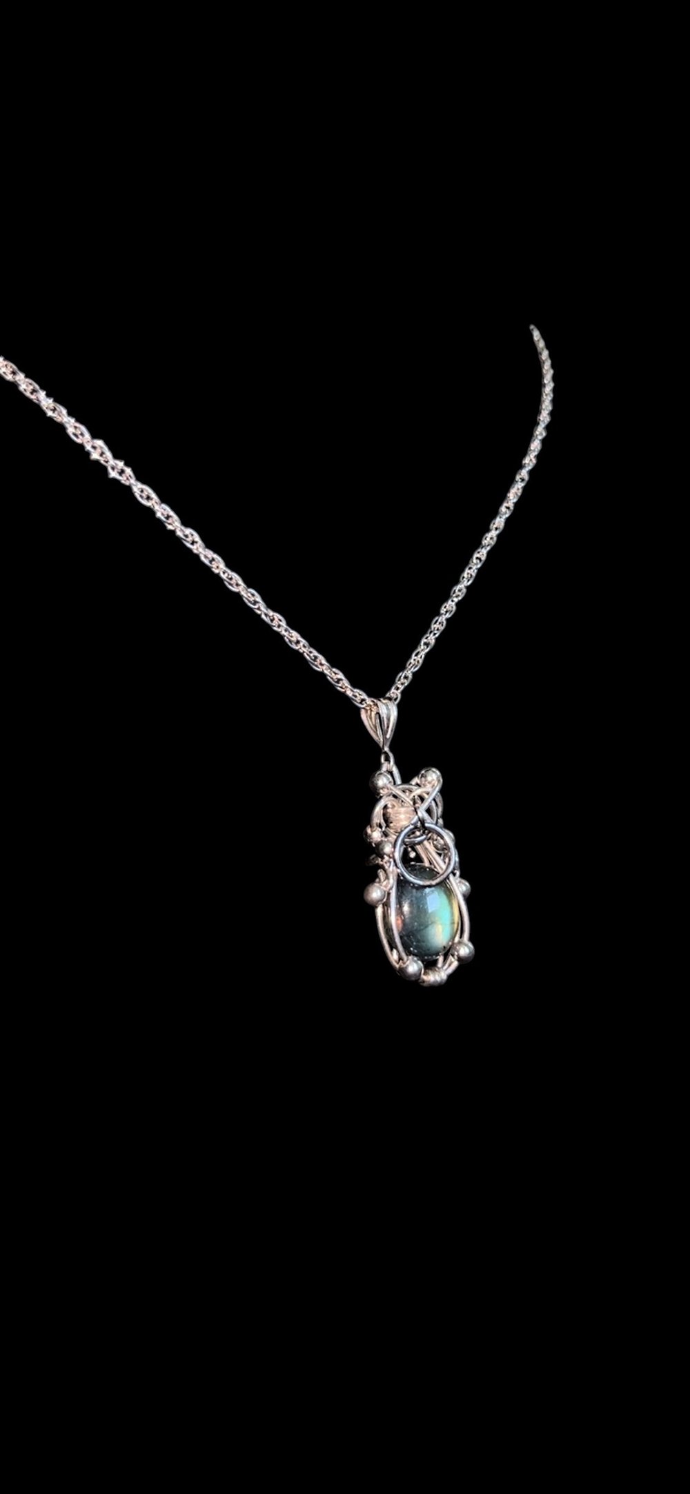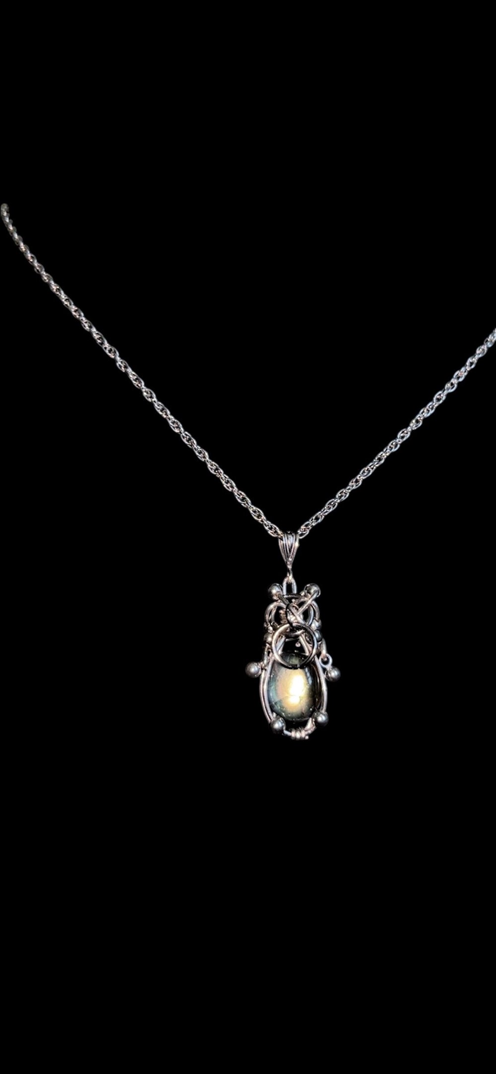 Color shifting Labradorite wrapped in .925 sterling silver, accented with sterling silver orbs and pierced with stainless steel rings throughout the piece.