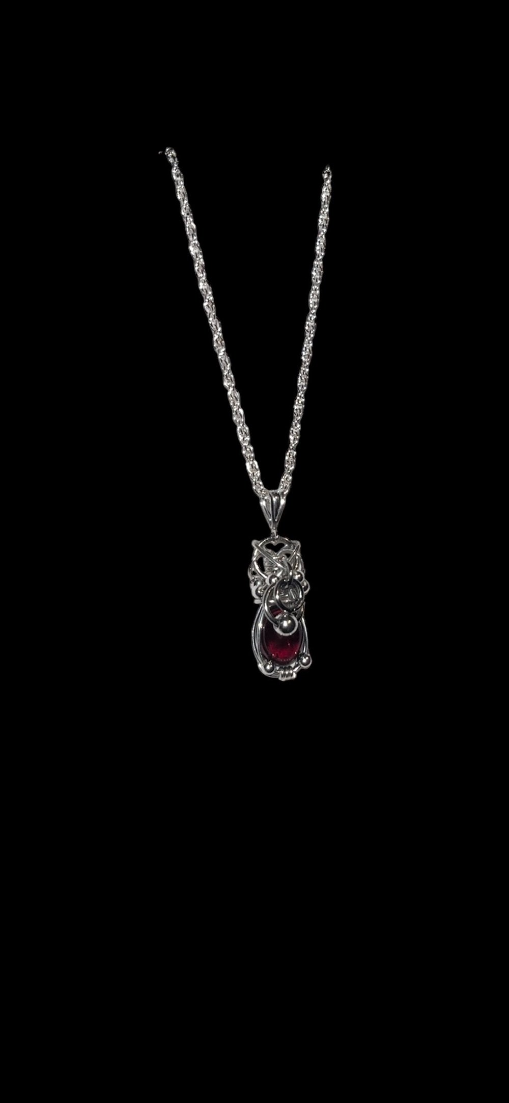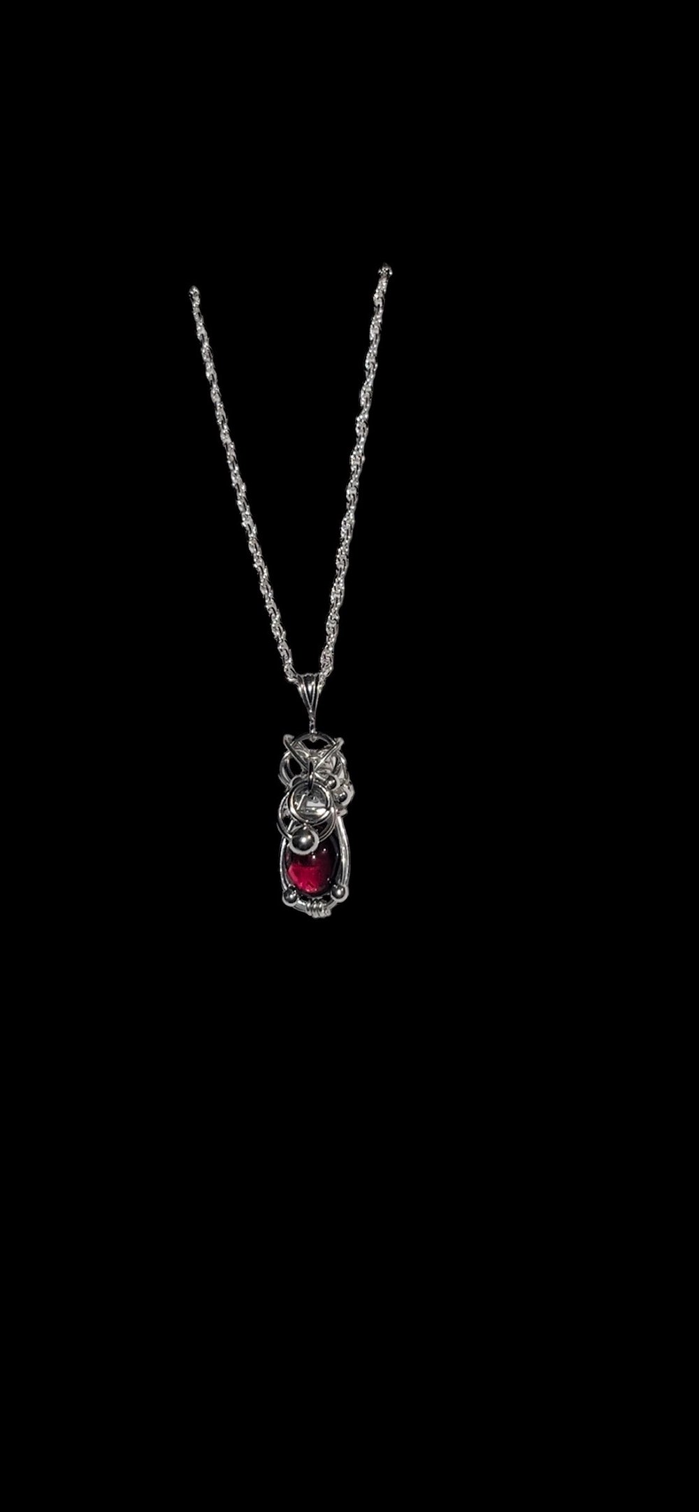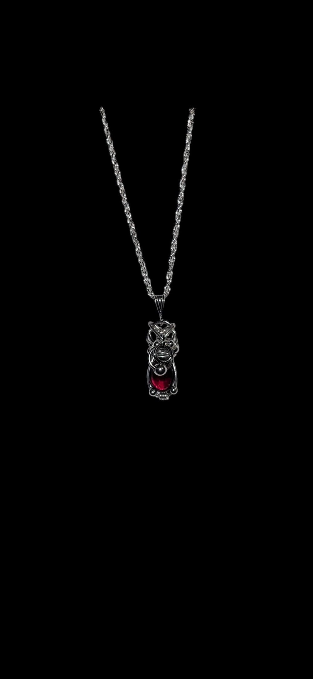 Mini blood red garnet wrapped in .925 sterling silver, pierced with stainless steel rings throughout the pendant. The Lucy necklace's little sister ♡