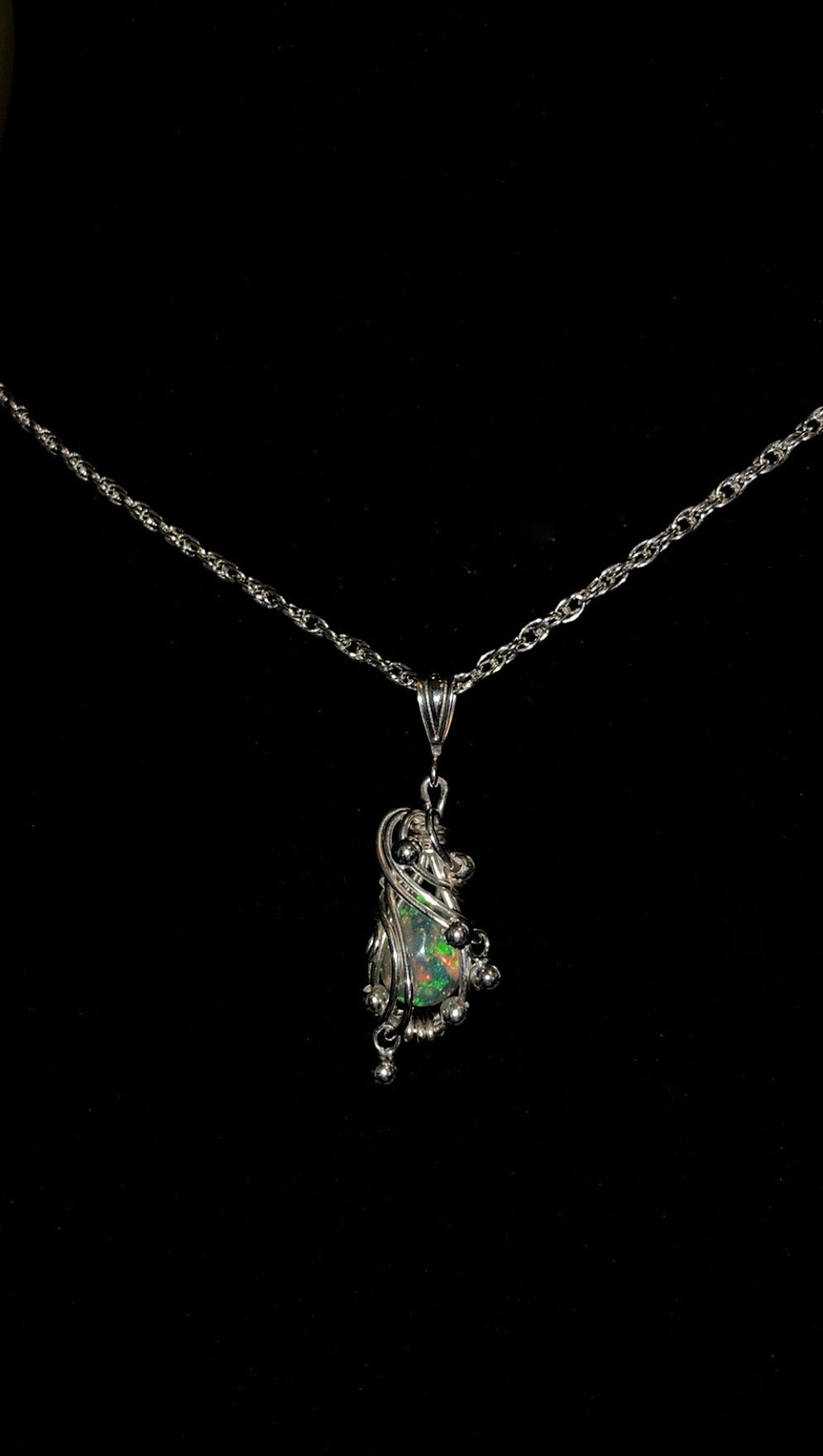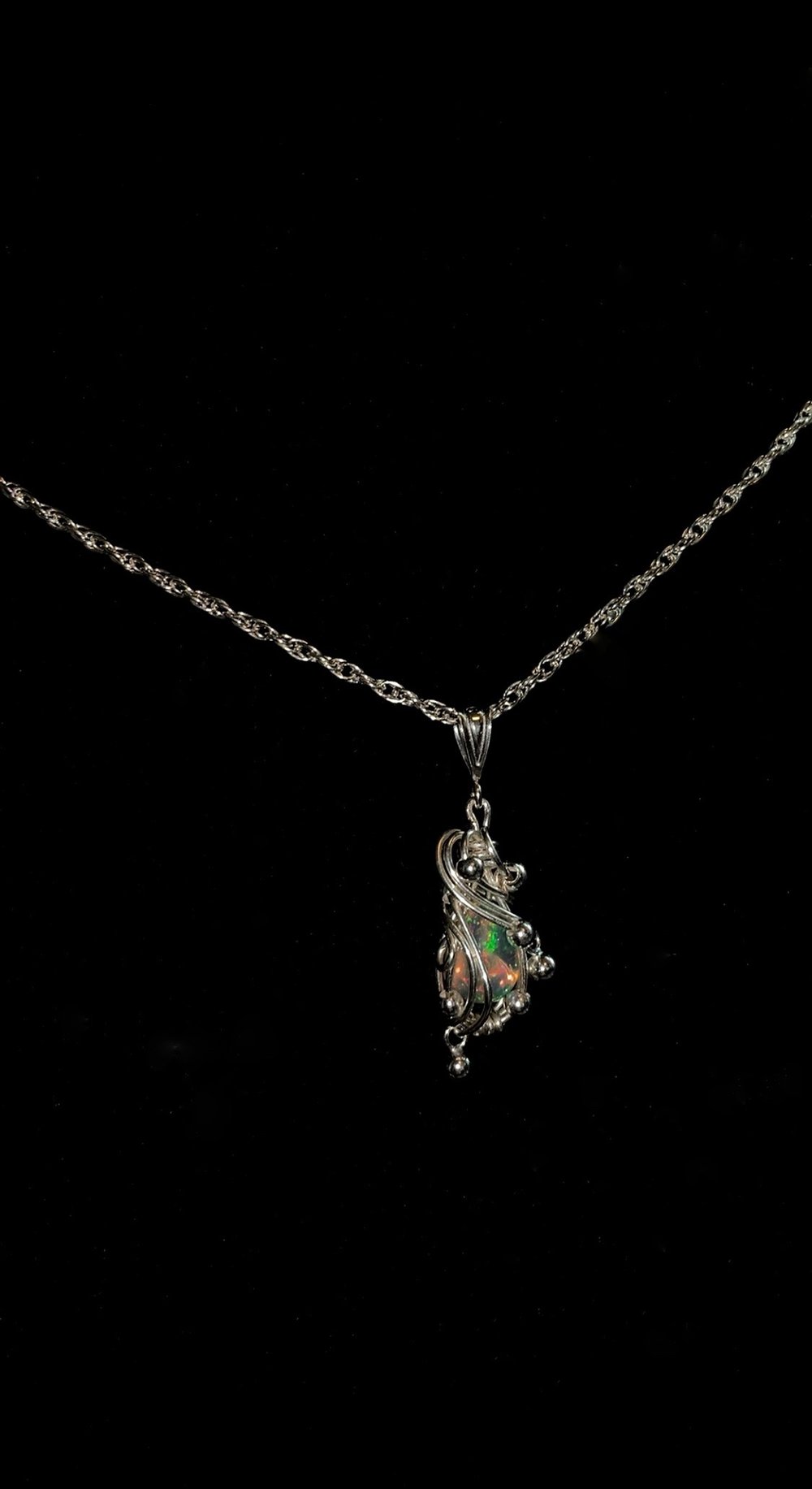 Opal wrapped in .925 sterling silver, encased in asymmetrical swirls throughout the piece and finished with sterling silver hanging orb embellishments.