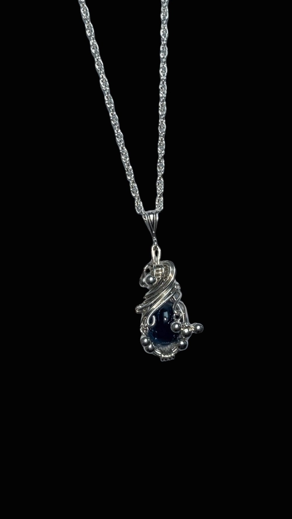 Deep blue natural sapphire wrapped in .925 sterling silver swirls. Heavily embellished with sterling silver beads throughout the piece.