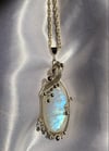 Maximalist, deep blue toned Rainbow Moonstone necklace wrapped in .925 sterling silver. Adorned with hanging beads and sterling silver orbs throughout the piece. Handmade with love in NYC, 1/1.