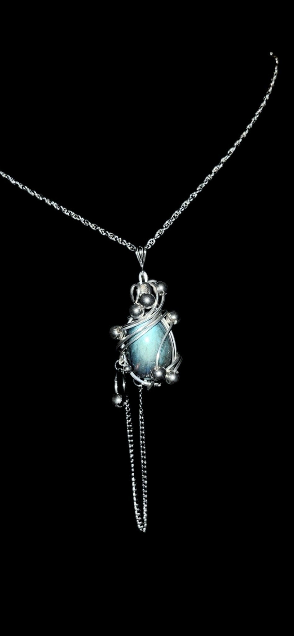 Bright blue/ teal flash labradorite wrapped in .925 sterling silver. Adorned with sterling silver orbs and swirls throughout the piece, and finished with a hanging stainless steel chain and stainless steel piercing on the pendant.