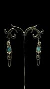 Reminiscent of the sea, sirens, and water nymphs, these earrings were created with handpicked natural Opals, and were wrapped in delicate free-flowing .925 sterling silver swirls and sterling silver orb embellishments. Finished with sterling silver pierced rings inspired by hypnosis rings, and hanging stainless steel chains that flow and move as you wear them.