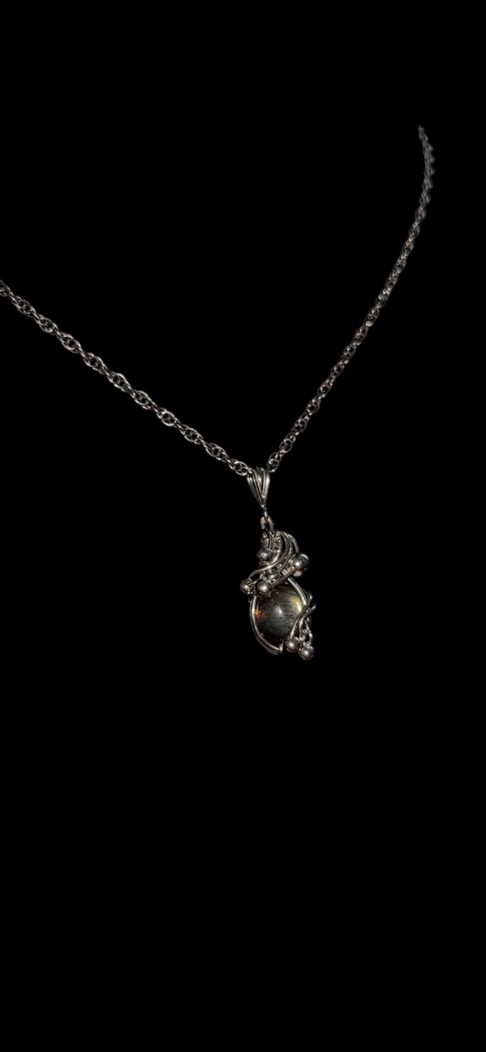 Mini Labradorite necklace wrapped in .925 sterling silver swirls with a grey/ green toned flash present in the center of the crystal. Adorned with sterling beads and hanging orbs throughout the piece. May you experience wish fulfillment through wear. ♡